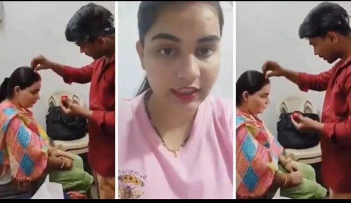 व्हायरल व्हिडिओत मुलगा मुलीच्या डोक्यात सिंदूर भरताना दिसतो. सिंदूर लावत असताना आसपास कोणी दिसत नाही. मुलगा मुलीच्या डोक्यात सिंदूर भरत असताना दुसरा कोणीतरी तिथे व्हिडिओ बनवत होता. व्हिडिओमध्ये लग्न केल्यानंतर मुलगी समोर येऊन बोलली. मी माझ्या मर्जीने कोर्टात लग्न केलं. माझ्यावर कोणाचा दबाव नव्हता.
