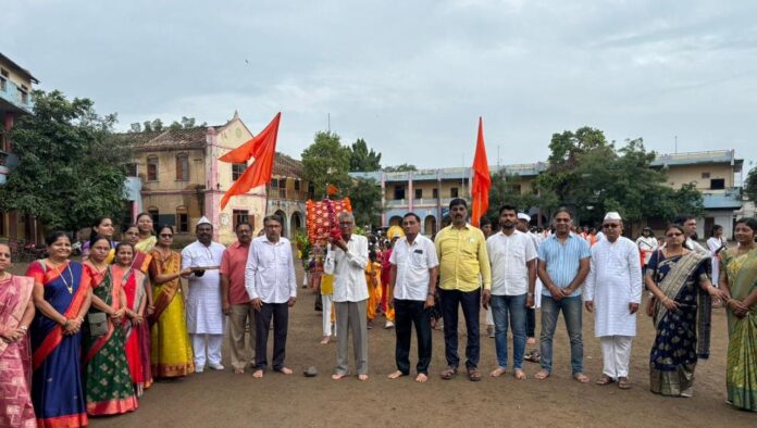 एरंडोल :- शिक्षण प्रसारक मंडळ संचलित न्यू इंग्लिश मीडियम स्कूल ची ,आषाढ वृक्ष संवर्धन वारी ,मोठ्या आनंदाने ,उत्साहात एरंडोल शहरात संपन्न झाली. या आषाढी वारीची सुरुवात रा ती काबरे विद्यालयाच्या मैदानावरून झाली प्रथम पालखीतील पांडुरंग परमात्म्याच्या प्रतिमेचे पूजन, संस्थेचे अध्यक्ष शरदचंद्रजी काबरे, सचिव राजीवजी मणियार, शालेय समिती अध्यक्ष डॉक्टर नितीन राठी, सभासद अनिल बिर्ला, धीरज काबरे सतीश परदेशी, परेश बिर्ला शाळेचे प्रिन्सिपल हॅरी जॉन ,व्हाईस प्रिन्सिपल सरिता पाटील यांच्या हस्ते पूजन करून दिंडी सोहळ्याचे प्रस्थान सर्वांच्या उपस्थितीत झाले . याप्रसंगी शाळेतील मित्रा चव्हाण व भाग्यश्री महाजन या विद्यार्थ्यांनी विद्यार्थी पांडुरंग परमात्मा व हर्षाली पाटील व हर्षिता पाटील या विद्यार्थिनी माता रुक्माई च्या वेशभूषेत सहभागी होते. तसेच शाळेतील इयत्ता पहिली ते दहावीच्या सर्व विद्यार्थ्यांनी लेझीमच्या तालावर नृत्य सादर करून एरंडोल नगरवासियांना मंत्रमुग्ध केले. व विठू नामाच्या गजराने सर्व बालगोपाल या वारकरी संप्रदायाच्या वारसा जपत या दिंडी सोहळ्याचा आनंद घेत नाचत विठू नामाचे नाम घेत मोठ्या आनंदाने या दिंडी सोहळ्याचा आनंद घेतला .या दिंडी सोहळ्यात शाळेचे प्रिन्सिपल ,व्हॉइस प्रिन्सिपल ,सर्व शिक्षक, शिक्षकेतर कर्मचारी उपस्थित होते . तसेच संस्थेचे अध्यक्ष श्री शरदचंद्रजी काबरे यांच्यावतीने सर्व विद्यार्थ्यांना उपासाचा चिवडा वाटण्यात आला व शाळेच्या वतीने सर्व विद्यार्थ्यांना व शिक्षक , शिक्षकेतर कर्मचाऱ्यांना आषाढी एकादशीनिमित्त फराळ राजगिरा लाडू वाटप करण्यात आले.