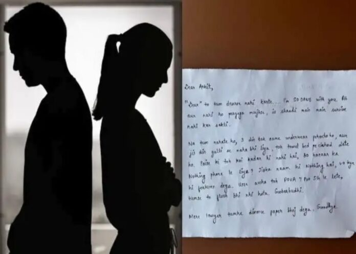 या घटस्फोट पत्रात पत्नी म्हणते, “डिअर अंकित, “डियर” तर तू डिझर्व्ह करत नाहीस. मी तुला कंटाळली आहे. आता आणखी सहन होऊ शकत नाही. मी या लग्नात सर्व्हाइव्ह करू शकत नाही. तू आंघोळ करत नाहीस, तीन-तीन दिस एकच अंडरवेअर (अंतर्वस्त्र) परिधान करतोस. ज्या दिवशी चुकून आंघोळ करतोस, त्या दिवशी टॉवेल बेडवच टाकून देतोस, पैशांची तर अजिबात किंमत नाही, तू ८० हजारांचा नथिंग फोन घेतलास. त्याचे नावच नथिंग, तो काय फीचर्स देणार. तुझ्याकडून तर फ्लशही होत नाही. ‘गोबरबुद्धी’! माझा वकील तुला घटस्फोटाचे कागदपत्रे पाठवेल. गुड बाय”